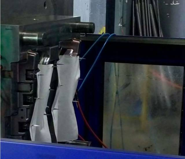 低壓注塑模具主要原理是注塑壓力較低在布上流動,開模時要先把布掛到前模掛針上,合模、注塑、然後取件。