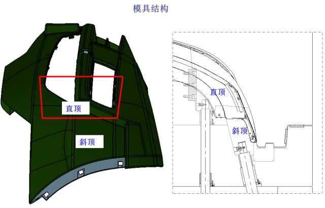 如下圖所示,產品兩頭采用直頂+斜頂的機構進行脫模。