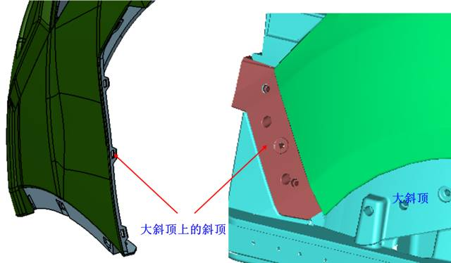 下圖所示產品底部藍色處采用在大斜頂上設計直頂的結構,使產品在頂出時以防產品頂出時同斜頂走。