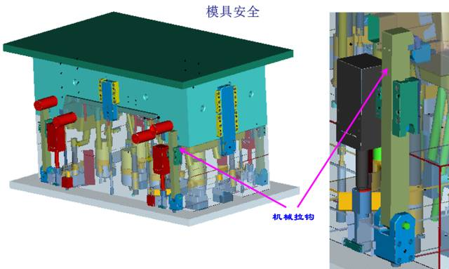 為了保證開模時斜頂跟前模一起同步運動,以使產品變形而脫模,當頂出機構同前模同步運動60MM後, 前/後模部分分離,這樣保護了模具,也保證了產品不會被拖傷!
