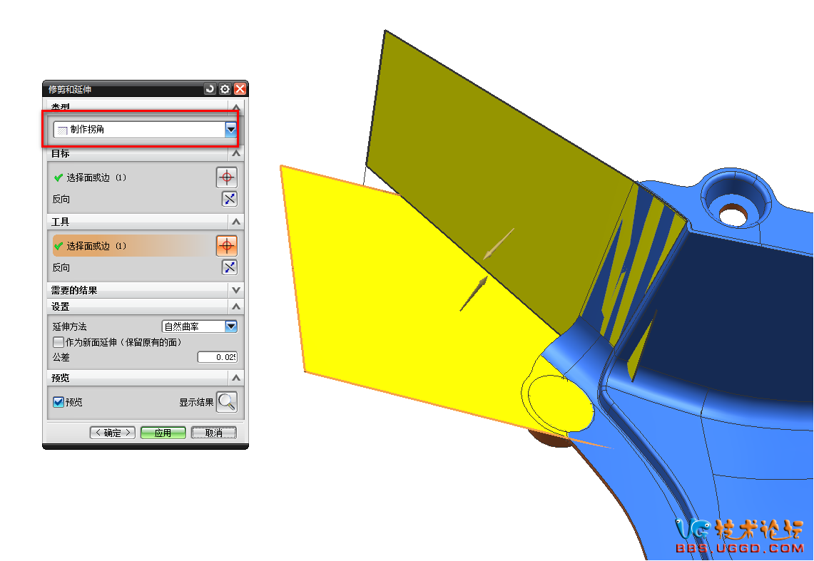 2.用“修剪和延伸”命令將兩個麵創建拐角,注意類型選擇製作拐角,結果如圖所示